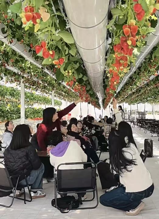 农场负责人顾晓明介绍,这一模式利用物联网技术,可通过手机软件灵活调控草莓支架高度,并对温湿度、水肥进行精准管理。这不仅提高了大棚空间利用率,使5.67亩的大棚每亩产量达4000斤,更创造了新奇有趣的采摘体验,周末单日游客量可达上千人次。
