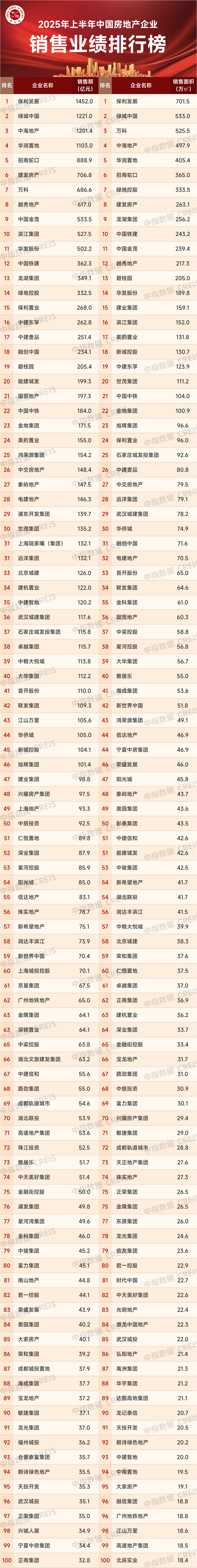 特别声明:房地产企业销售数据统计是以2025年1月1日-6月30日期间销售的商品房为统计口径,主要依据中指数据CREIS在各地的销售监测数据,并参考当期总体经营情况和推盘去化情况进行分析统计;对于少数没有在监测范围内的城市或项目,由企业提供相关证明文件,经课题组对数据进行严格审核,也纳入统计范围。本报告仅供参考,课题组不对使用报告及其内容所引发的任何直接或间接损失承担责任。